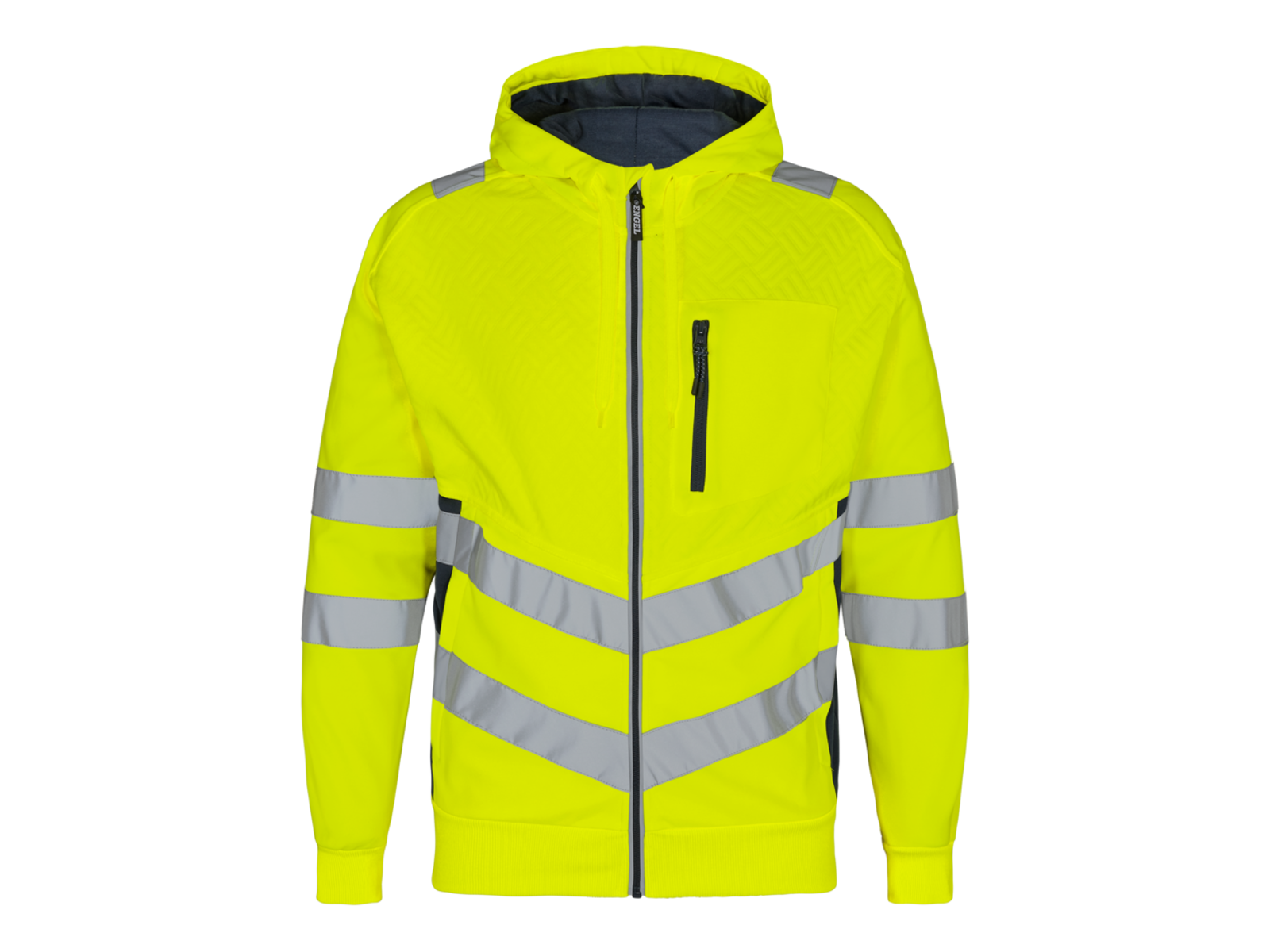 Funktionel og lækker fluorescerende sweat cardigan i moderne snit. Børstet inderside som gør den blød og behagelig. Reflekslynlås i front. To rummelige sidelommer samt brystlomme - alle med lynlås. Sweat cardiganen har vaffelstruktur på forstykket samt på hætten. Rib i ærmer og bund. Strækbare reflekser over skuldre samt omkring ærmer og liv. Beklædningsklasse 2. Testet efter 25 vaske.
