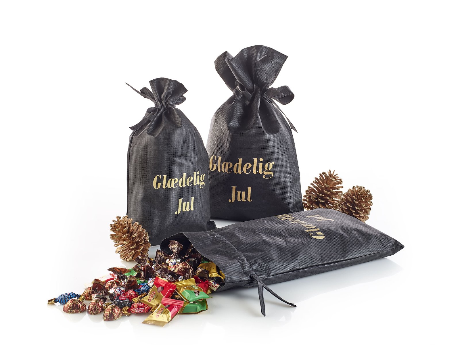 Sort stofpose - guldtryk "Glædelig Jul" m/1000 g. Toms Festival Mix; Mulighed for Private Label