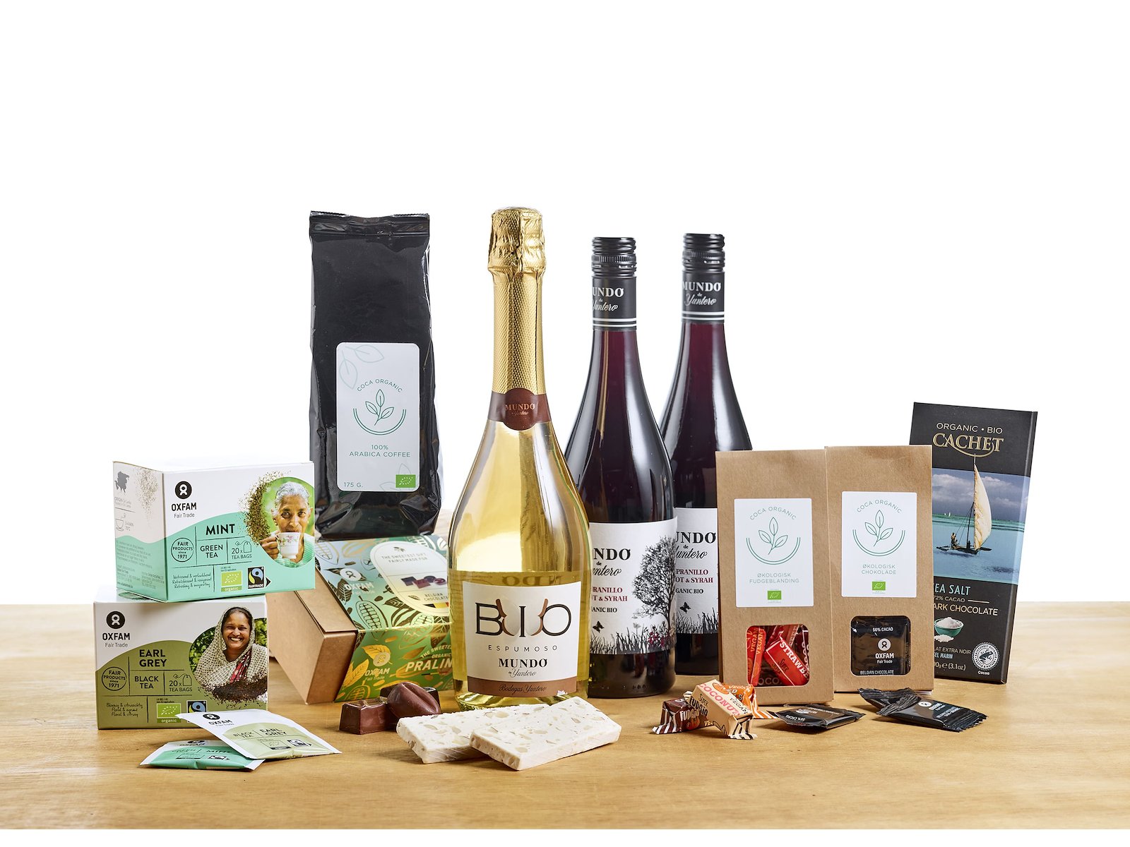 2 fl. Mundo de Yuntero, Organic Tempranillo, Merlot & Syrah, Spanien; 1 fl. Mundo de Yuntero, Bio Sparkling, Spanien; Oxfam Fairtrade - Økologisk Luksuschokolade 178 g.; Organic & Vegan Fudge 80 g.; Oxfam Fairtrade - Økologisk Kuvertchokolade mørk 60 g.; Oxfam Fairtrade - 2 stk. Økologisk Te, 2x20 Tebreve; Oxfam Fairtrade - 2 stk. Økologisk Nougatbar 2x30 g.; Økologisk Arabica Kaffe 175 g.; Cachet Organic - Chokoladeplade 90 g.; Pakket i kartonæske m/træuld