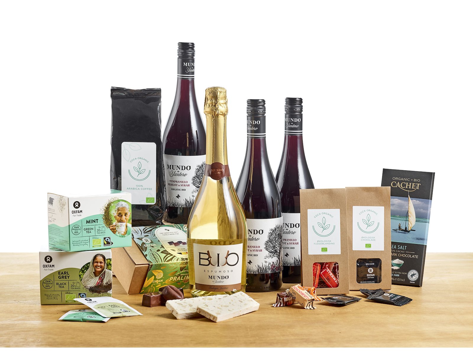 3 fl. Mundo de Yuntero, Organic Tempranillo, Merlot & Syrah, Spanien; 1 fl. Mundo de Yuntero, Bio Sparkling, Spanien; Oxfam Fairtrade - Økologisk Luksuschokolade 178 g.; Organic & Vegan Fudge 80 g.; Oxfam Fairtrade - Økologisk Kuvertchokolade mørk 60 g.; Oxfam Fairtrade - 2 stk. Økologisk Te, 2x20 Tebreve; Oxfam Fairtrade - 2 stk. Økologisk Nougatbar 2x30 g.; Økologisk Arabica Kaffe 175 g.; Cachet Organic - Chokoladeplade 90 g.; Pakket i kartonæske m/træuld